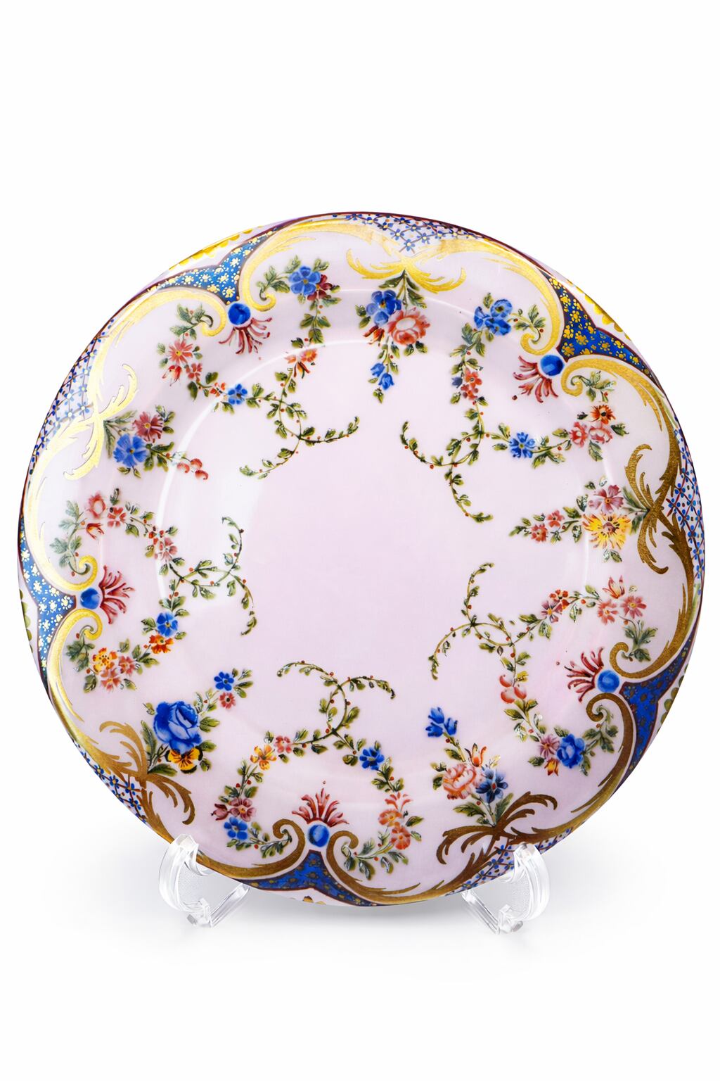 18世紀セーヴル磁器に着想を得た、優美な花綱模様が印象的なプレート缶。ブルーやピンクの小花が繊細なガーランドを描き、金彩とコバルトの縁取りが上品な華やかさを添えます。ブリキ製で軽量かつ扱いやすく、熱い食品を避ければサンドイッチや焼き菓子などを乗せて普段使いも可能。飾り皿としてはもちろん、室内用のディスプレーとしても楽しめる実用性を兼ね備えた一品です。
