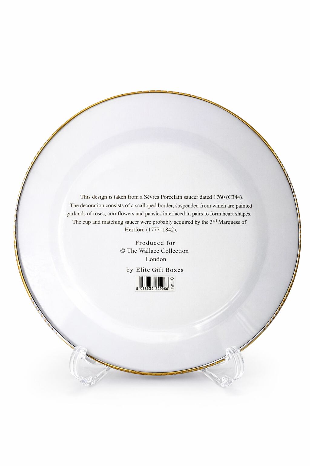 このカップおよび揃いのソーサーは、おそらく第3代ハートフォード侯爵(1777–1842)によって取得されたものと考えられています。」
