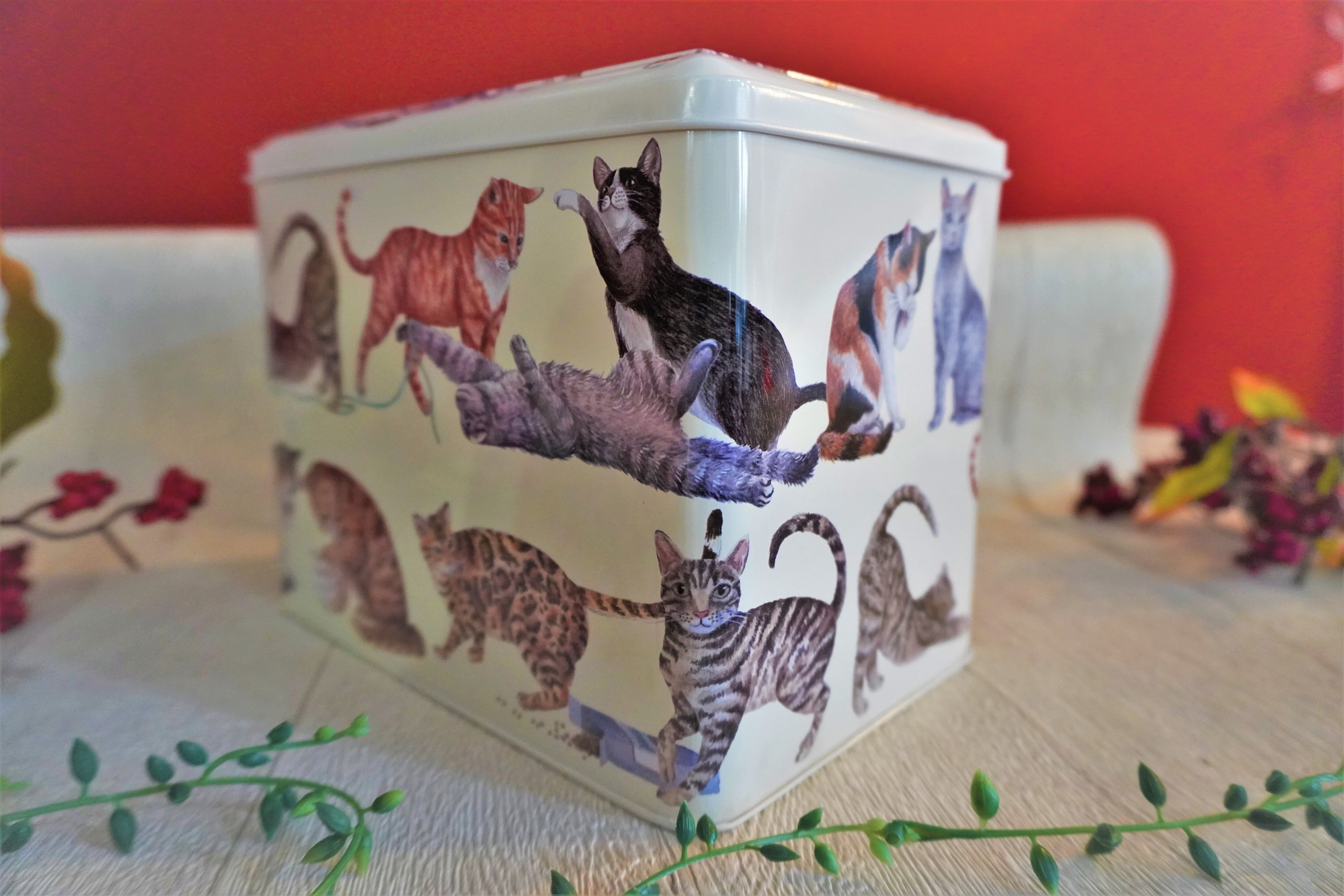 この缶は、お気に入りの猫のためのおやつを保管するのに使ったり、